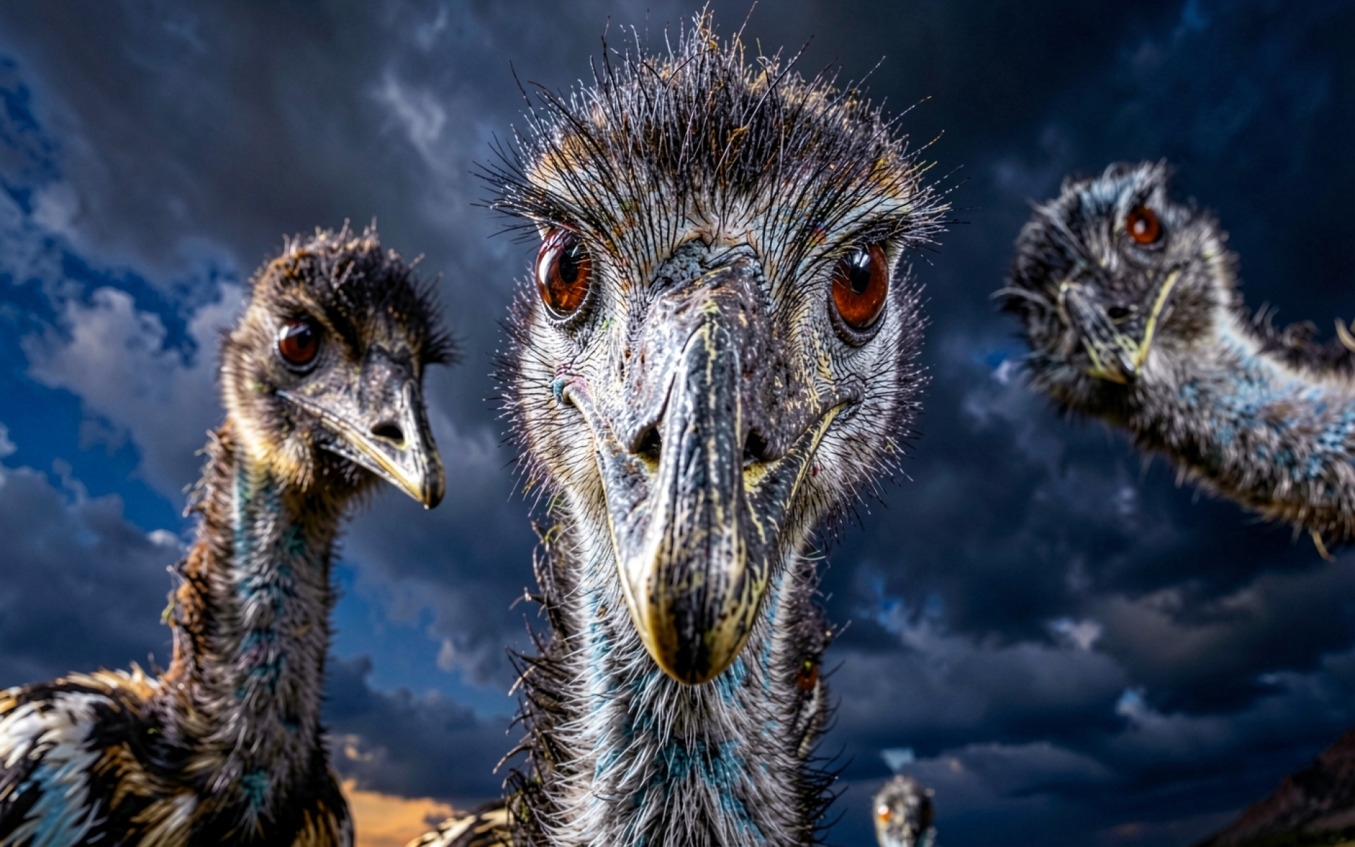Группа страусов на фоне темного грозового неба