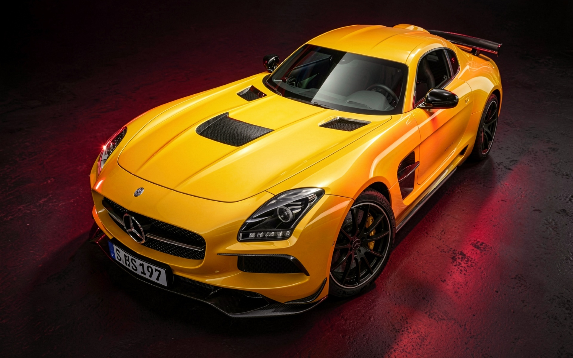 Желтый спорткар Mercedes-Benz SLS AMG в студии