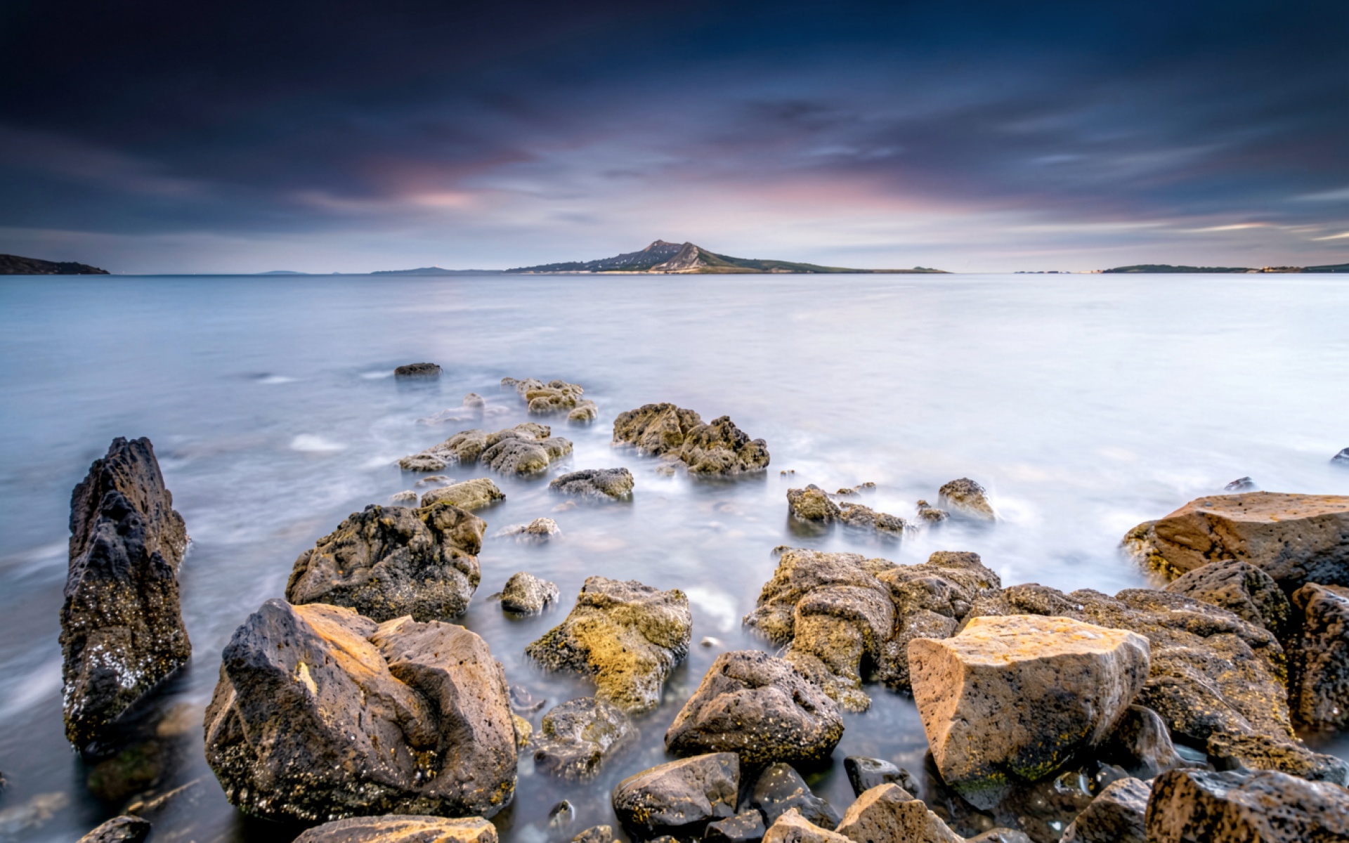 Каменистый берег моря в сумерках с островом