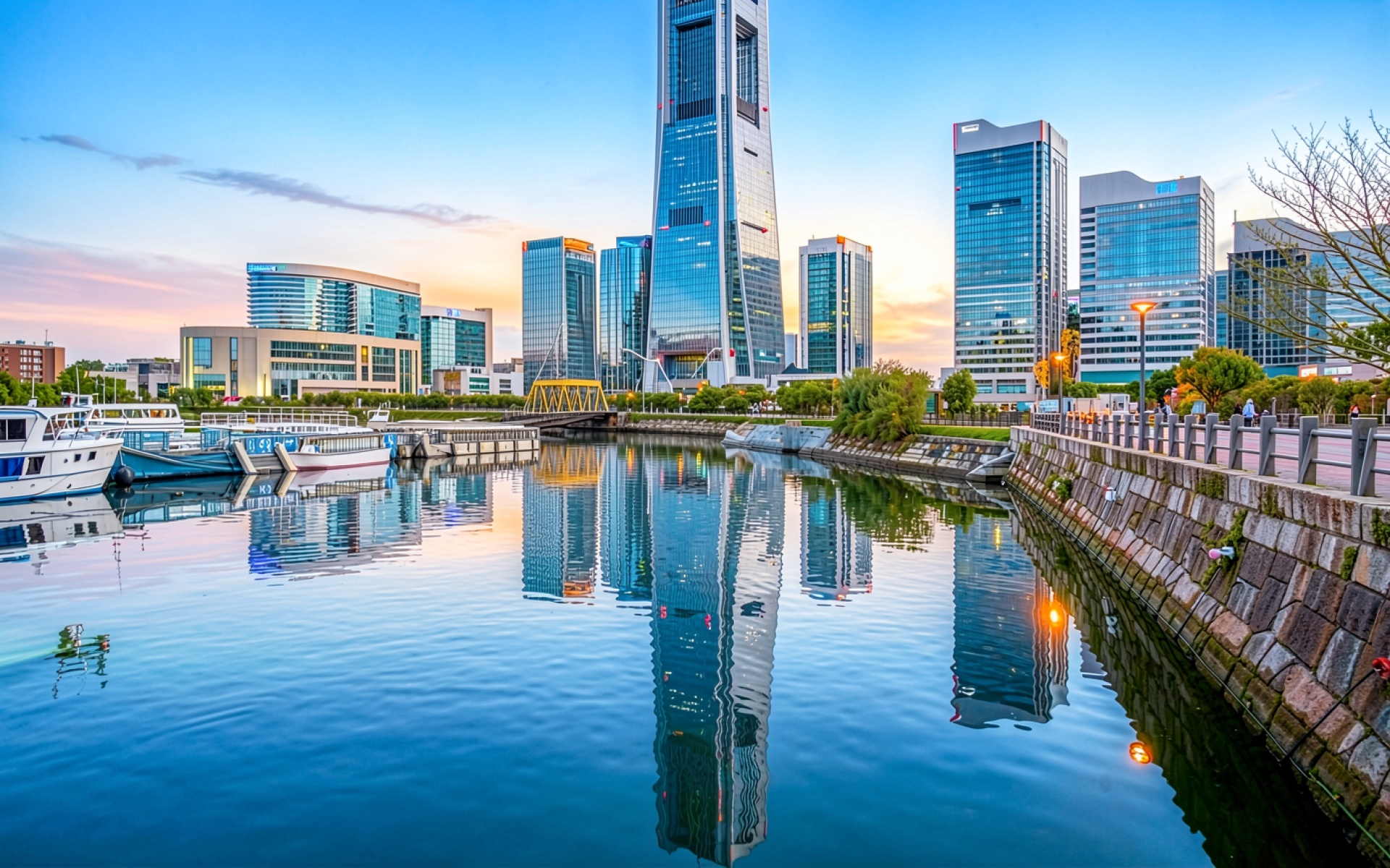 Современные небоскребы Йокогамы в синих сумерках