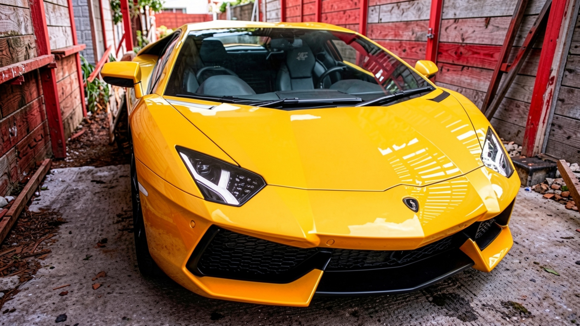 Желтый суперкар Lamborghini в гараже с красными стенами