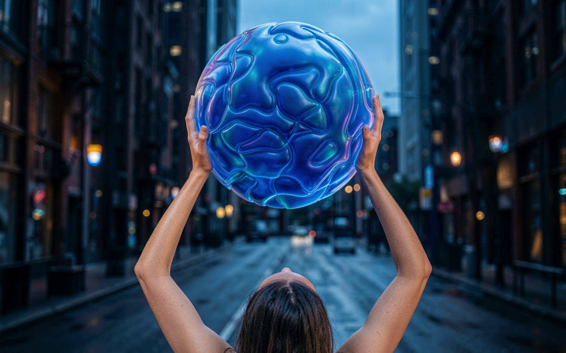 Девушка держит синюю светящуюся сферу в городе