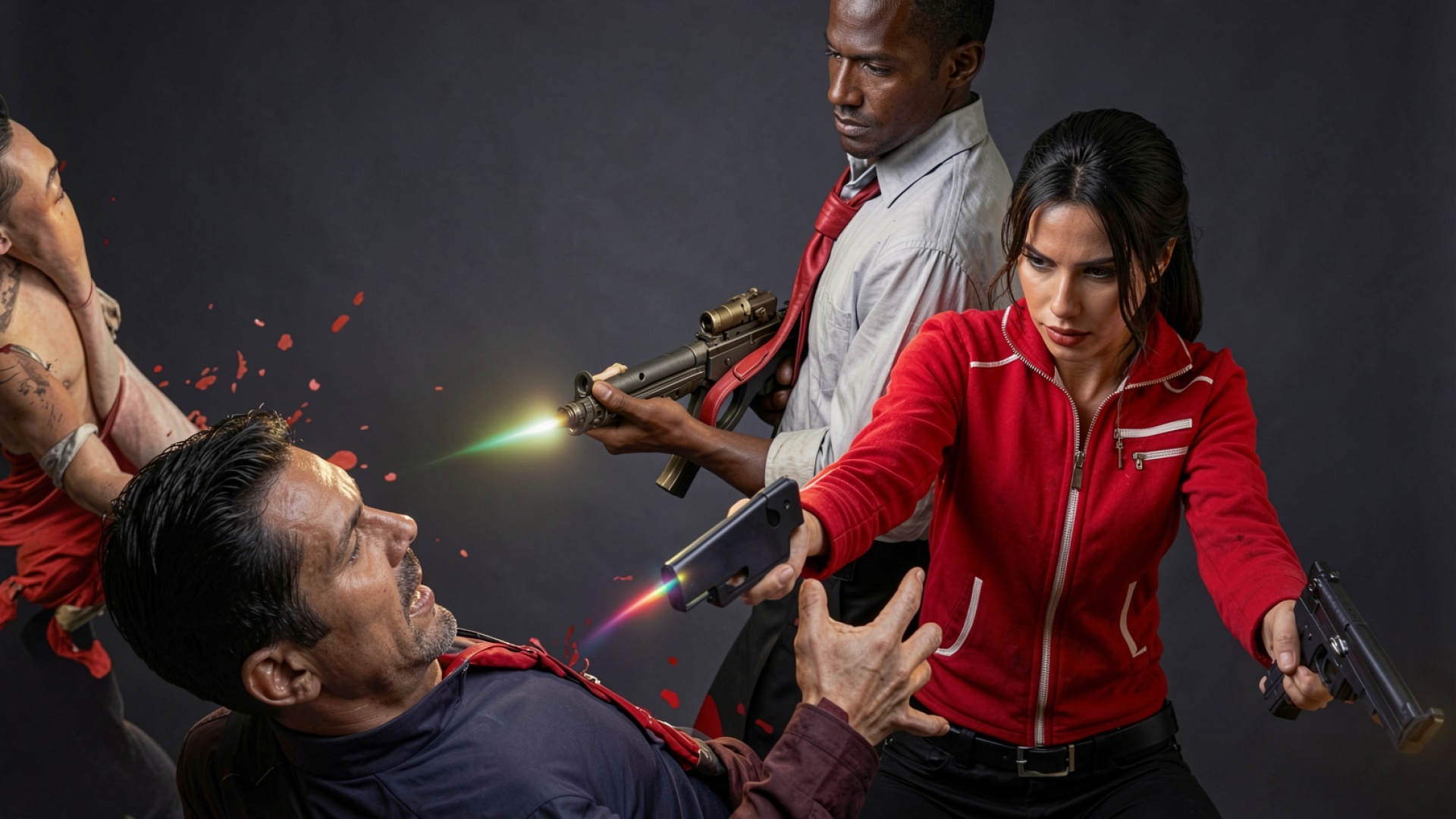 Сцена экшена красная куртка темный фон