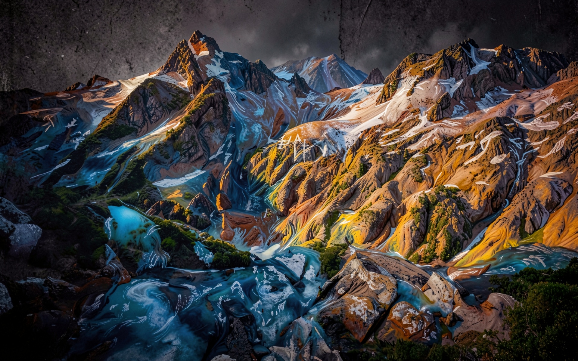 Сюрреалистичные горы в синих и золотых тонах