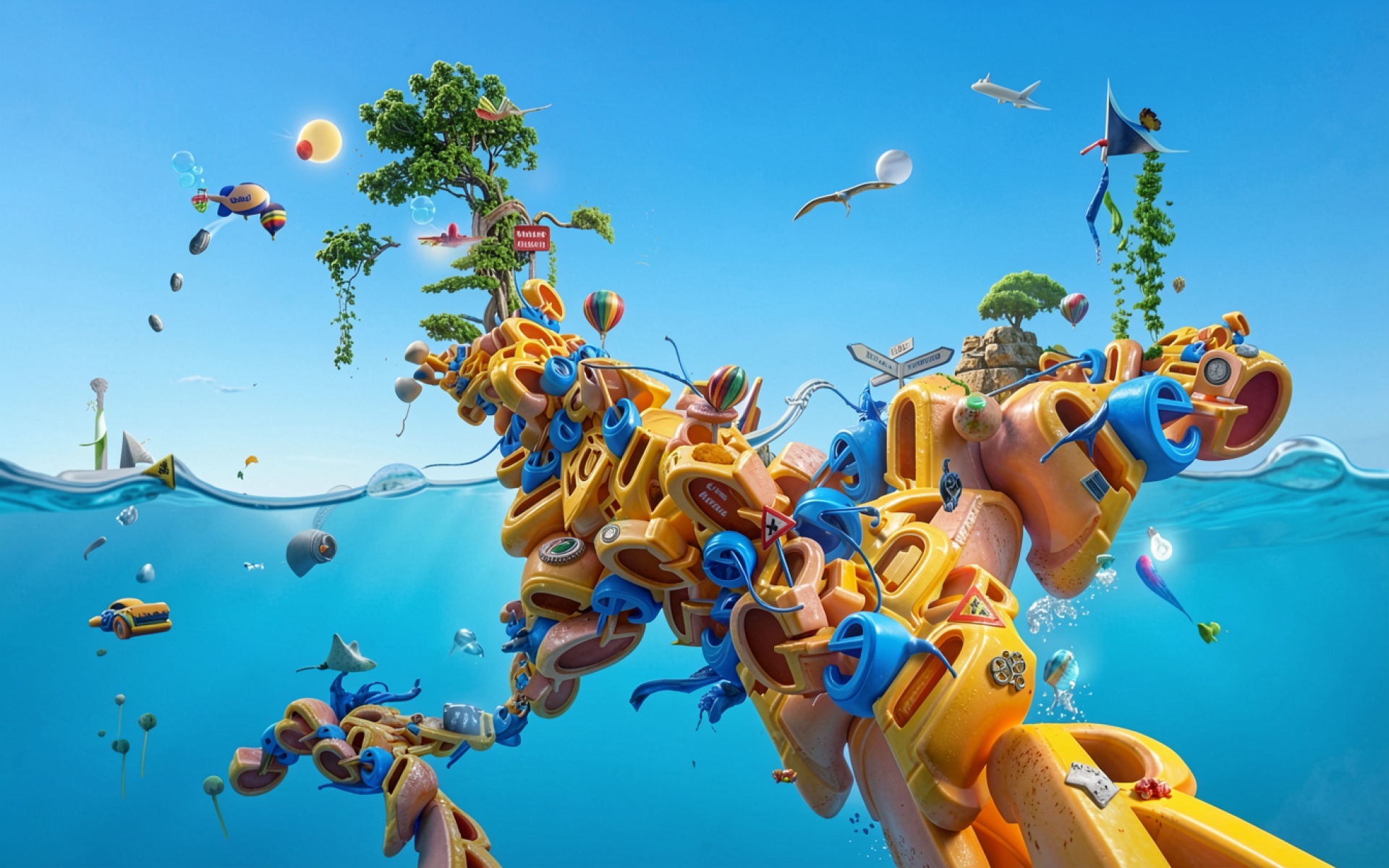 Сюрреалистичный остров из желтых пластиковых деталей в океане
