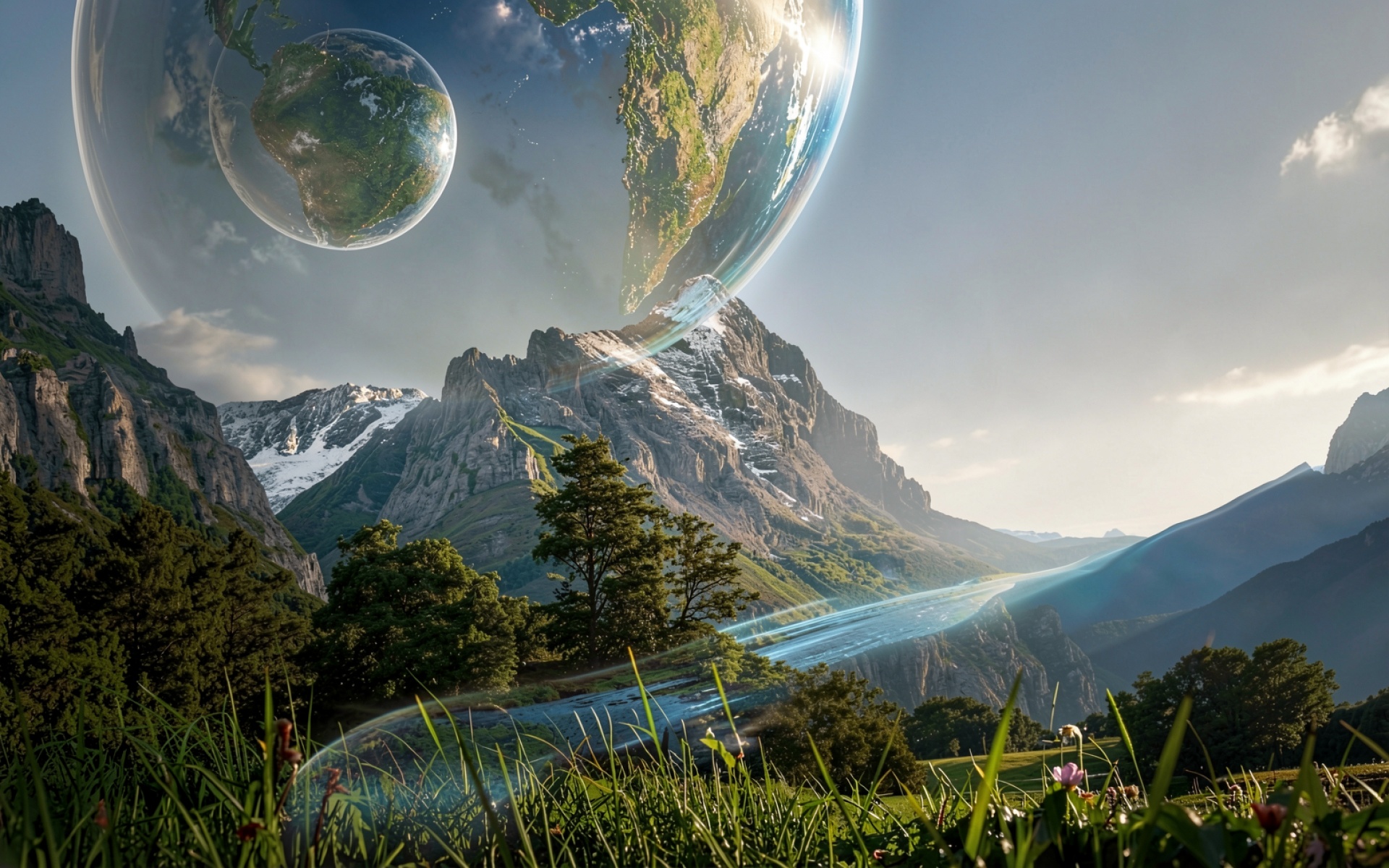 Сюрреалистичный пейзаж с планетами над горами