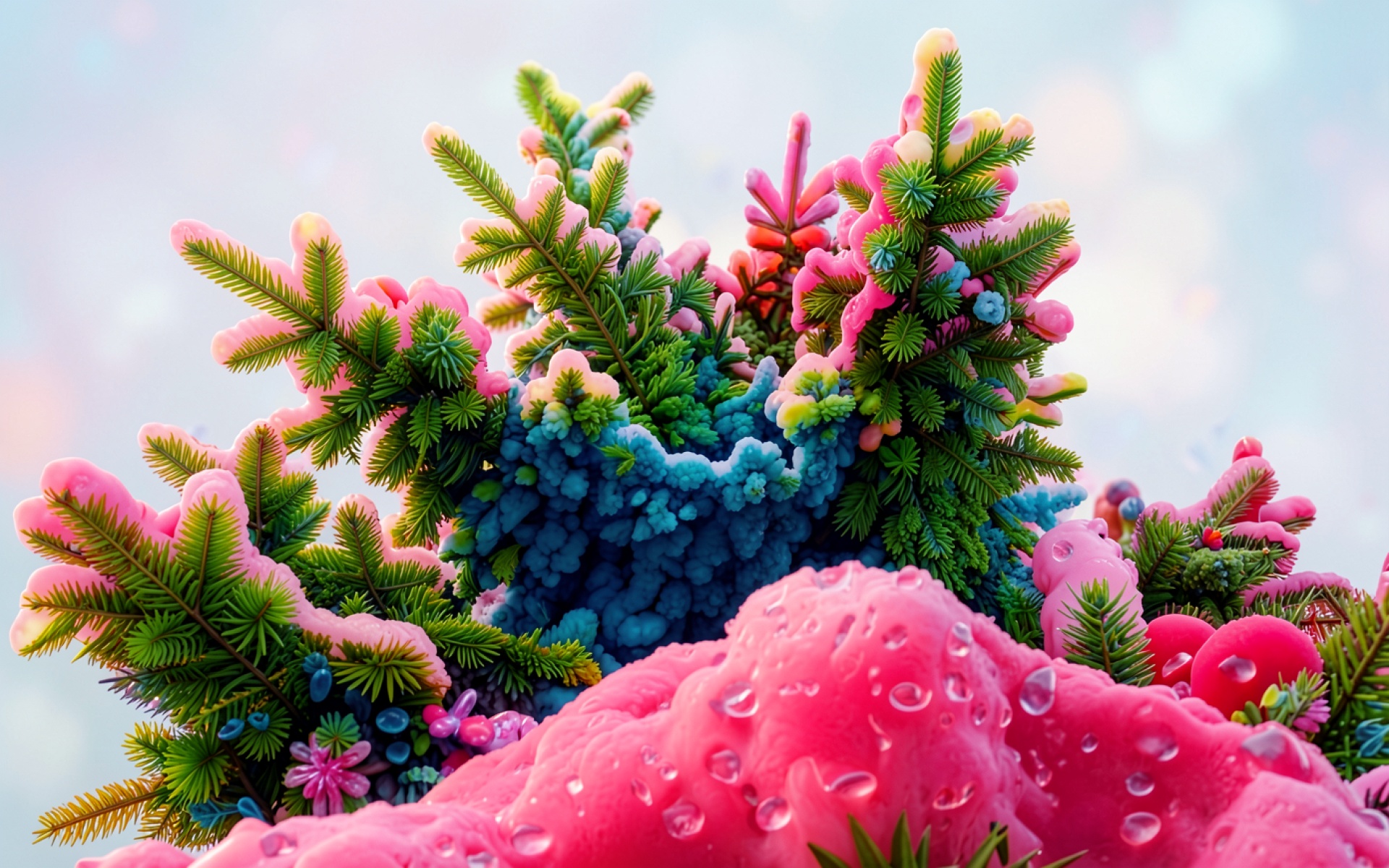 Сюрреалистичный лес розовых кристаллов и хвои