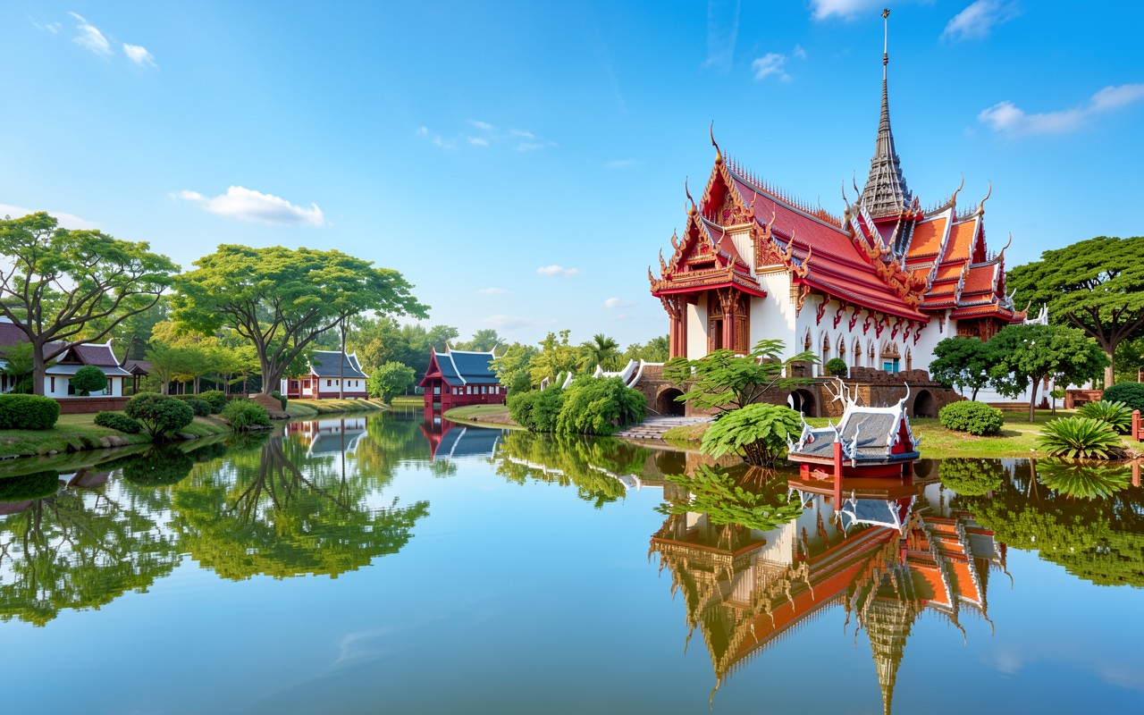 Тайский храм красный с отражением в воде