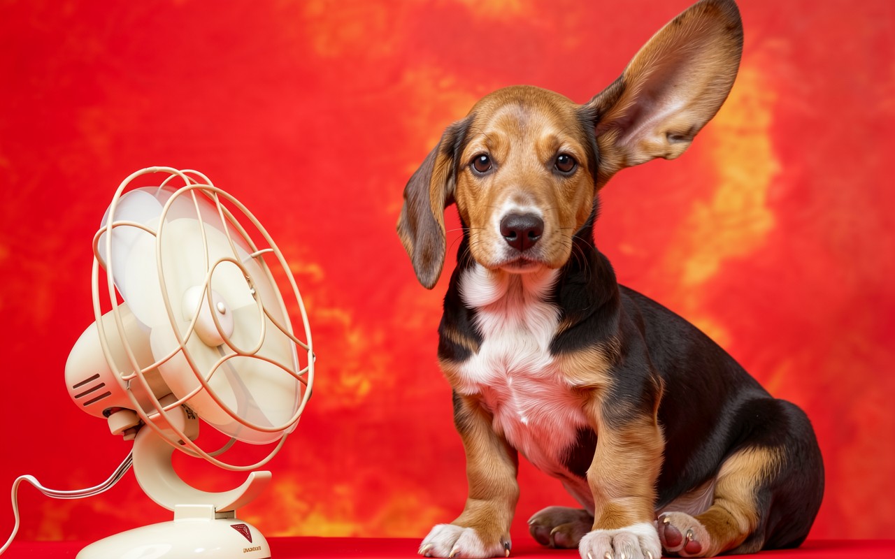 Щенок таксы с белым вентилятором на красном фоне