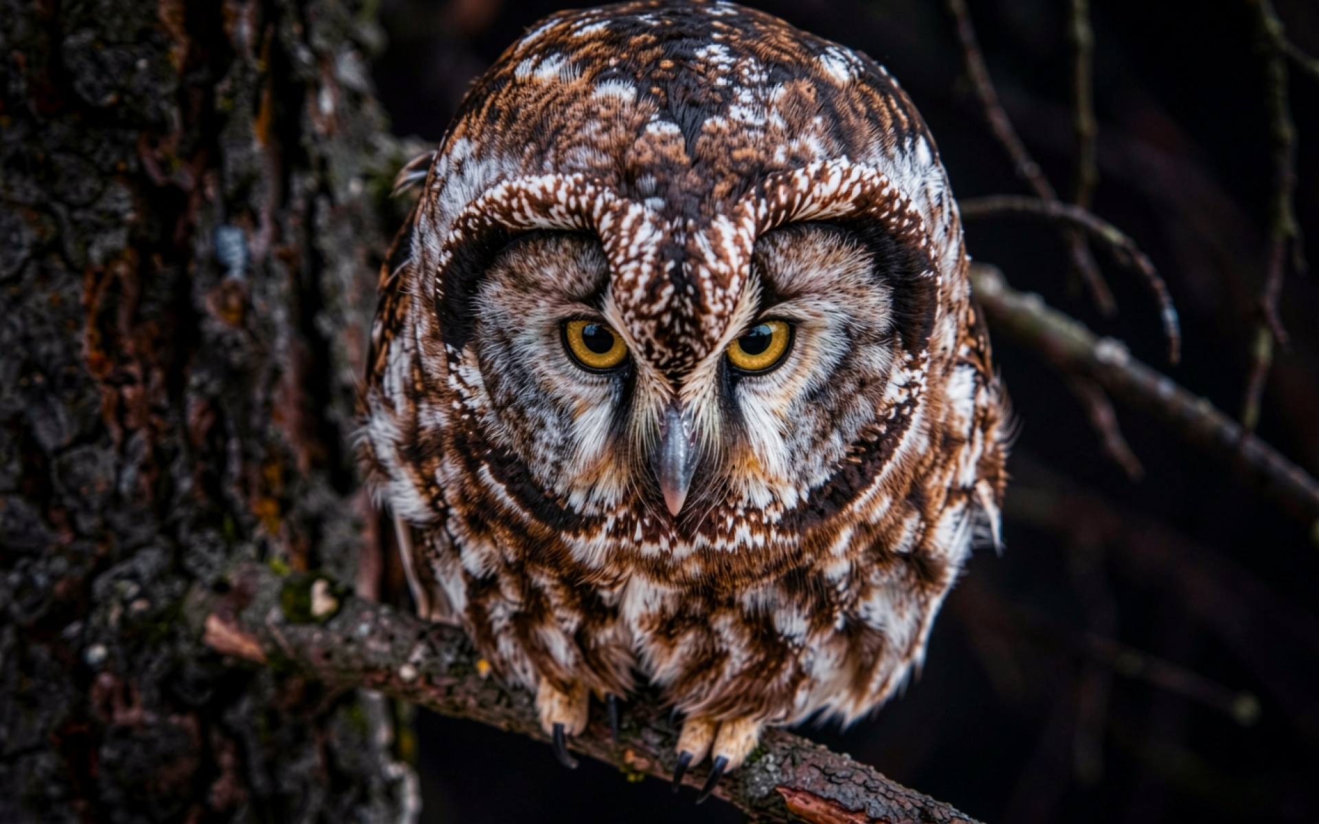 Коричневая сова на ветке темного леса