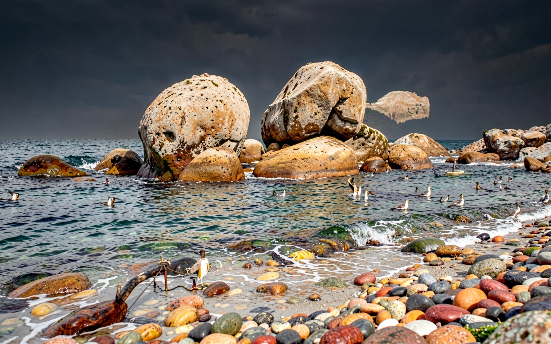 Огромные валуны на берегу темного моря
