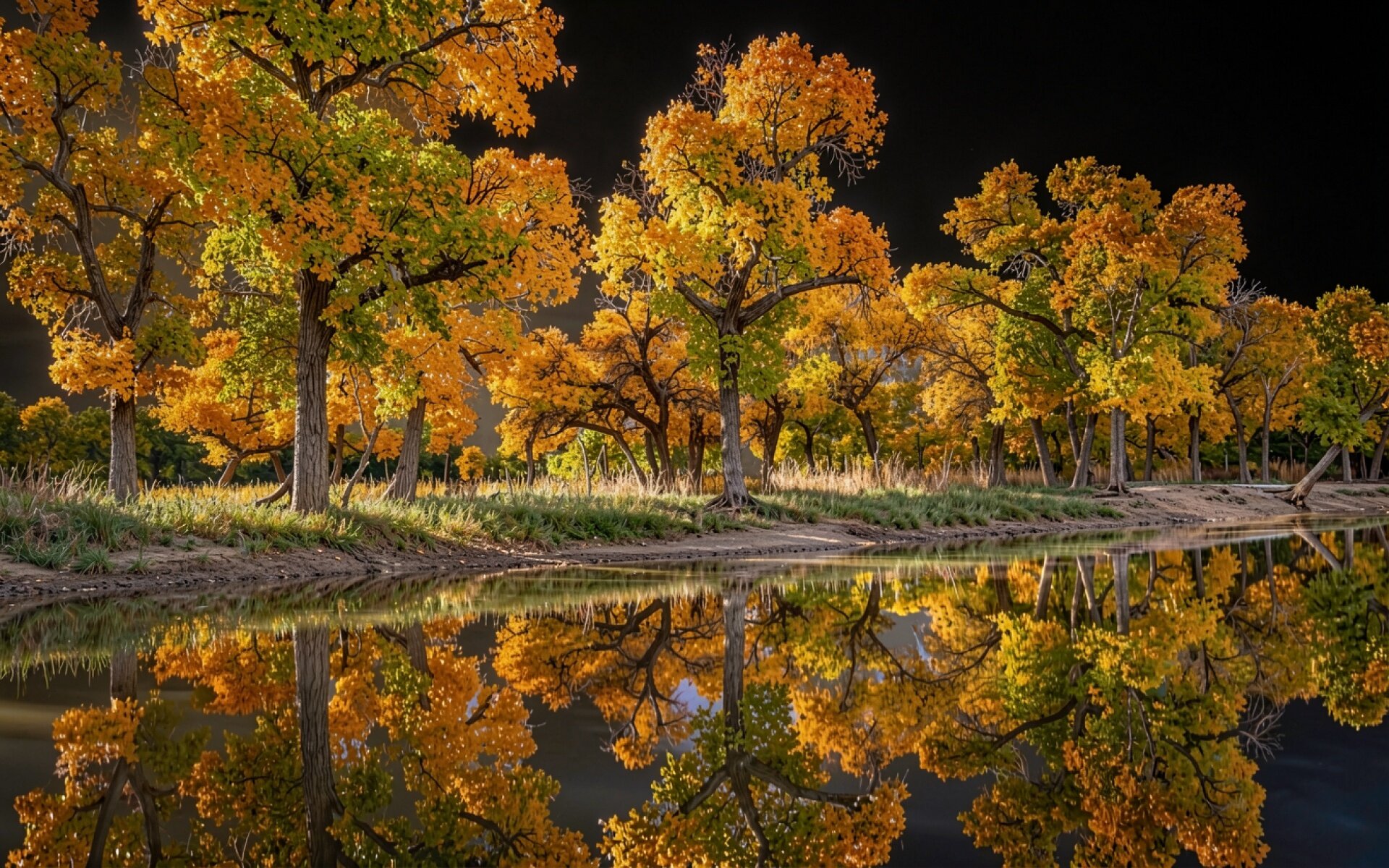 Осенние желтые деревья у темной воды