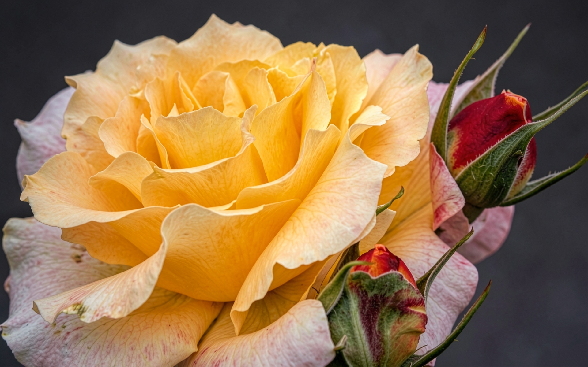 Желтая роза с красными бутонами на темном фоне