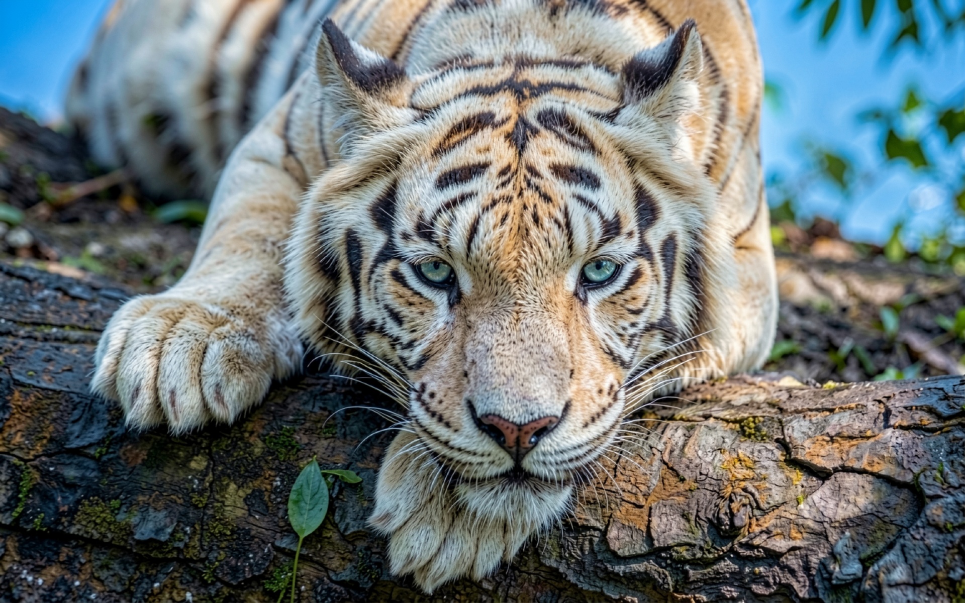Белый тигр на старом темном бревне
