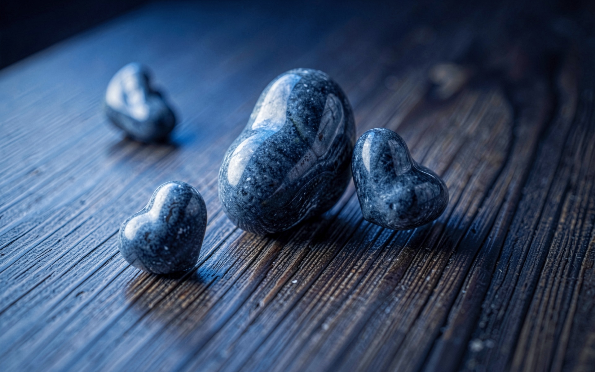Синие каменные сердца на темном дереве