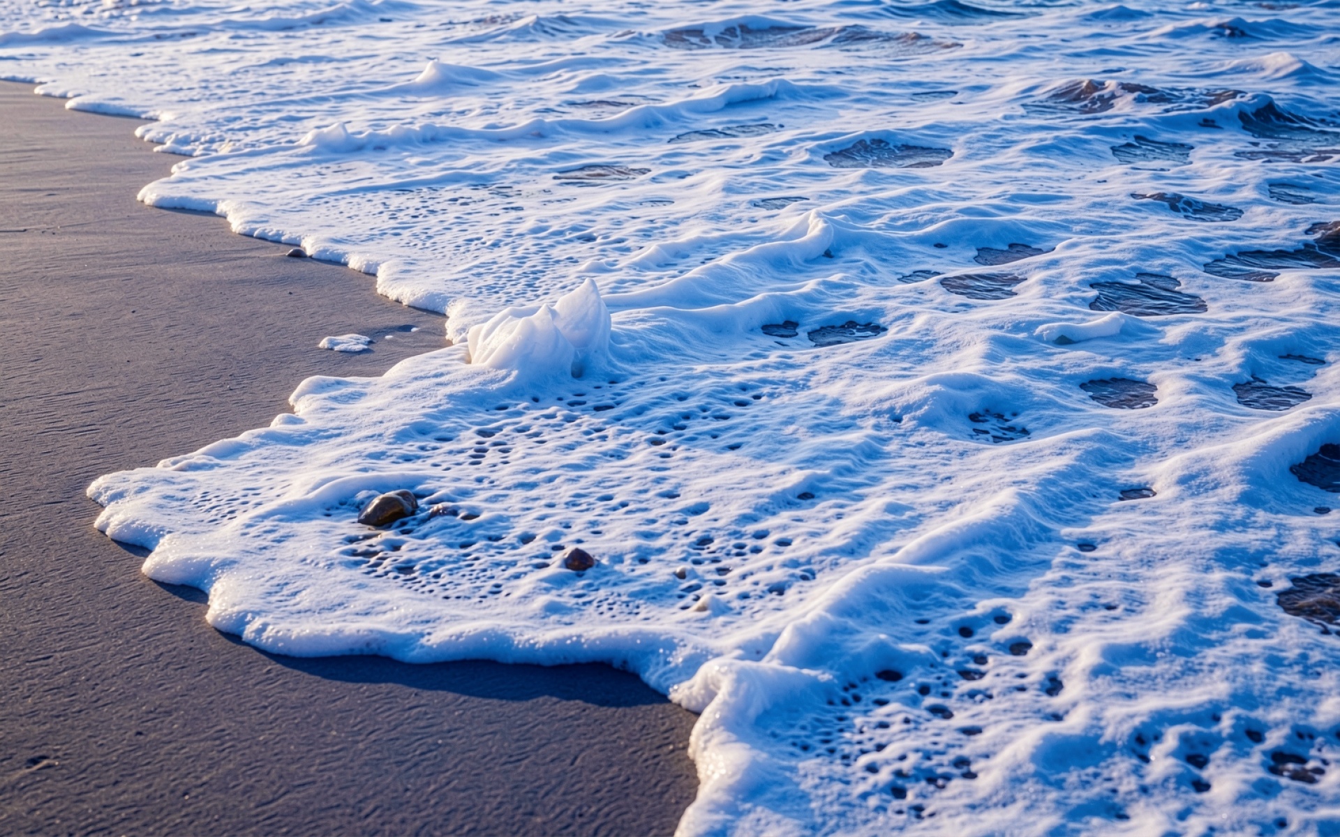 Белая морская пена на темном песке