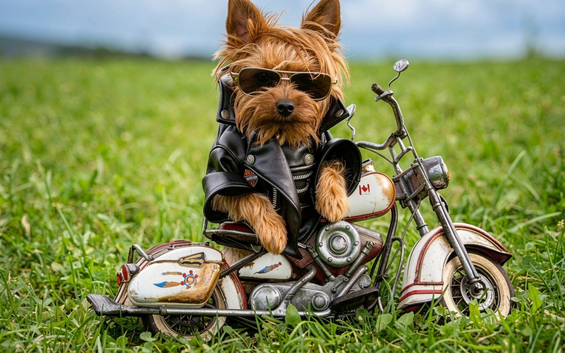 Йоркширский терьер в кожаной куртке на мотоцикле