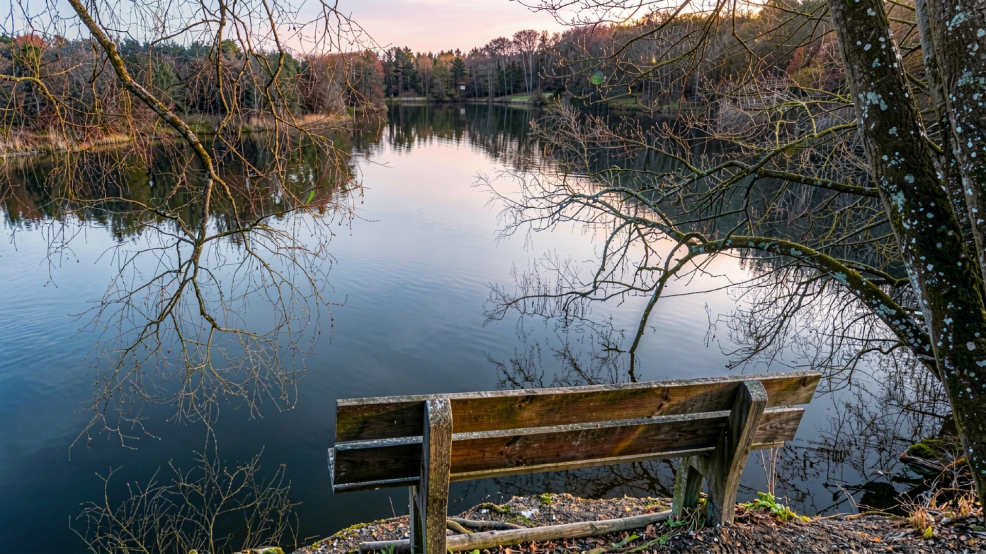 Деревянная скамья у тихого осеннего озера