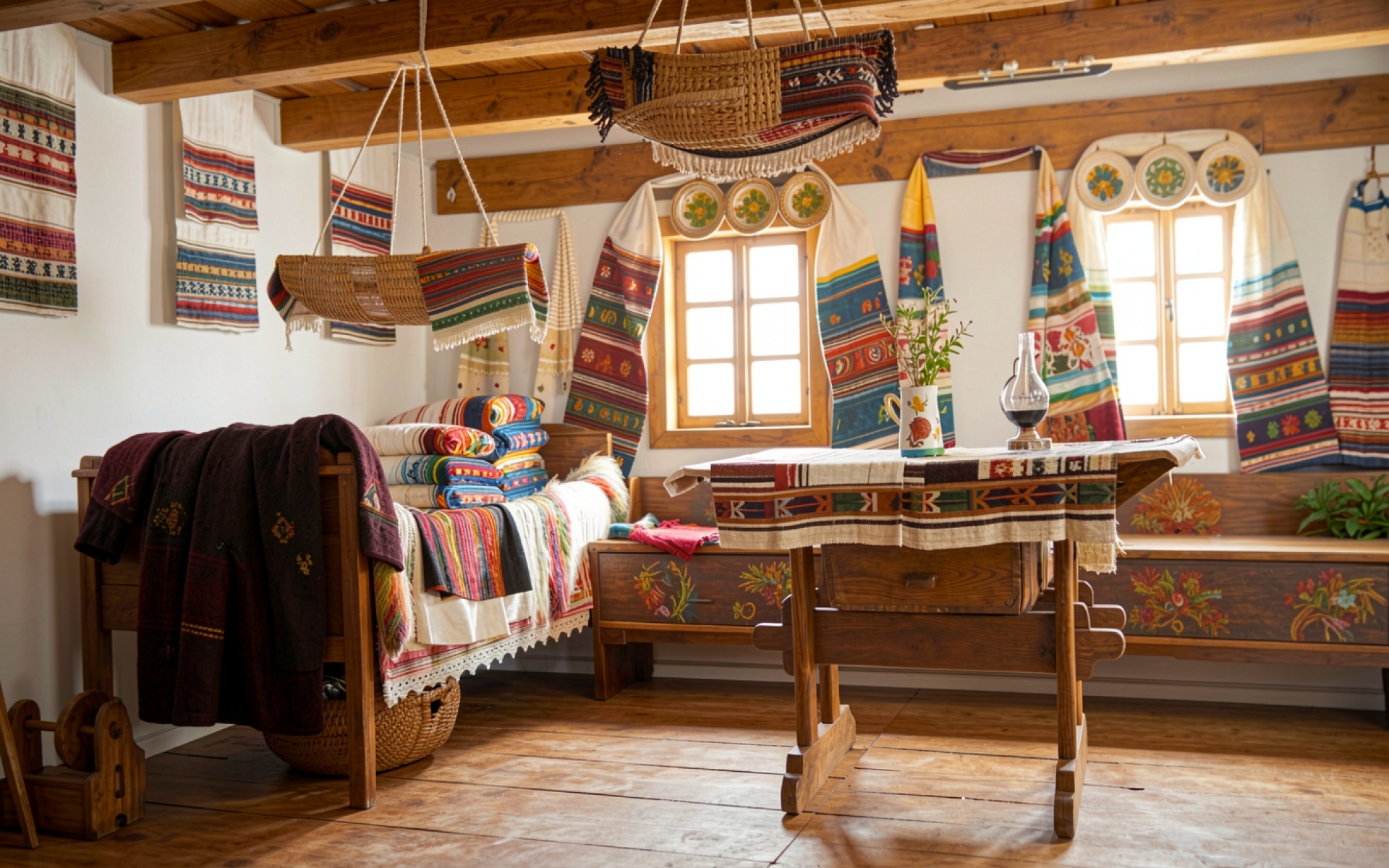 Интерьер традиционной деревенской комнаты с ткаными коврами