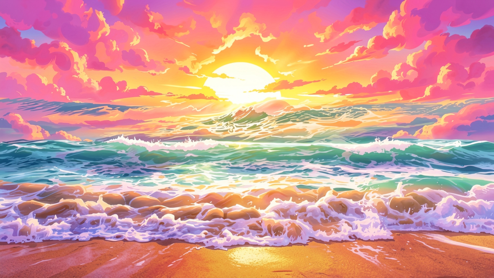 Закат над океаном в розовых тонах аниме