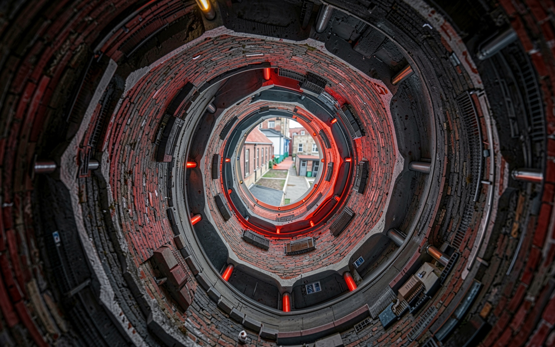 Кирпичный футуристический тоннель с красной неоновой подсветкой
