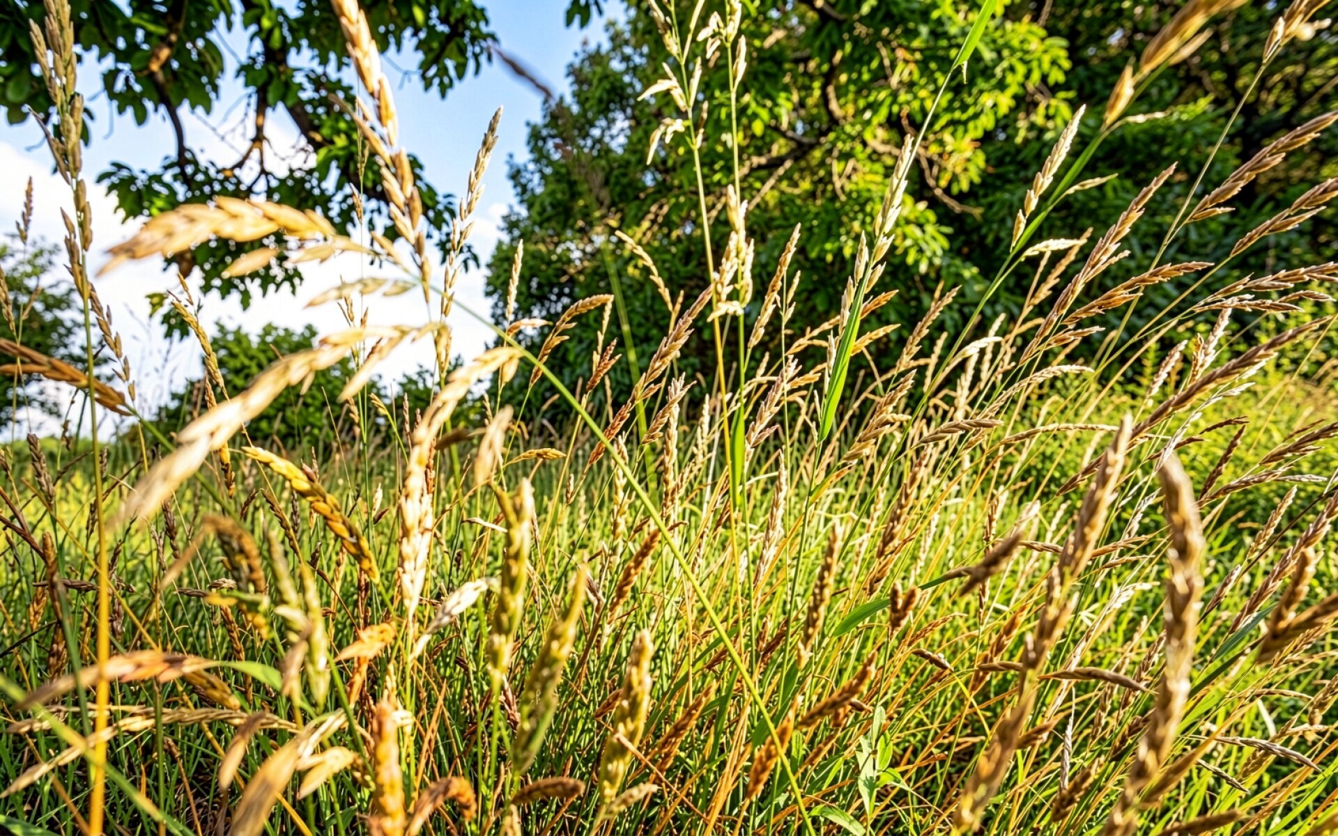 Золотистая высокая трава на фоне зеленых деревьев