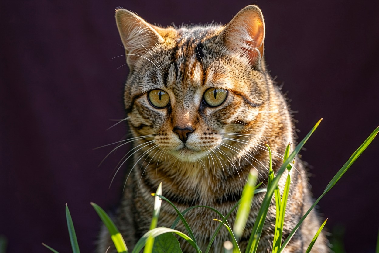 Полосатый кот в зеленой траве при солнце