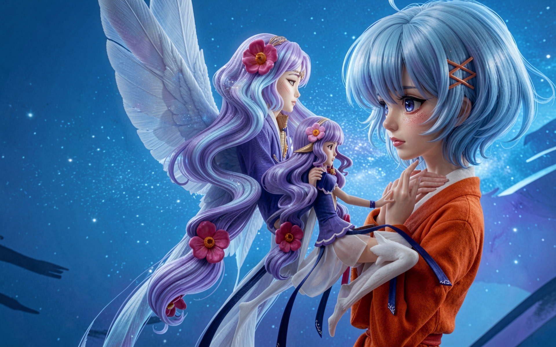 Три фэнтези девушки в синем звездном пространстве