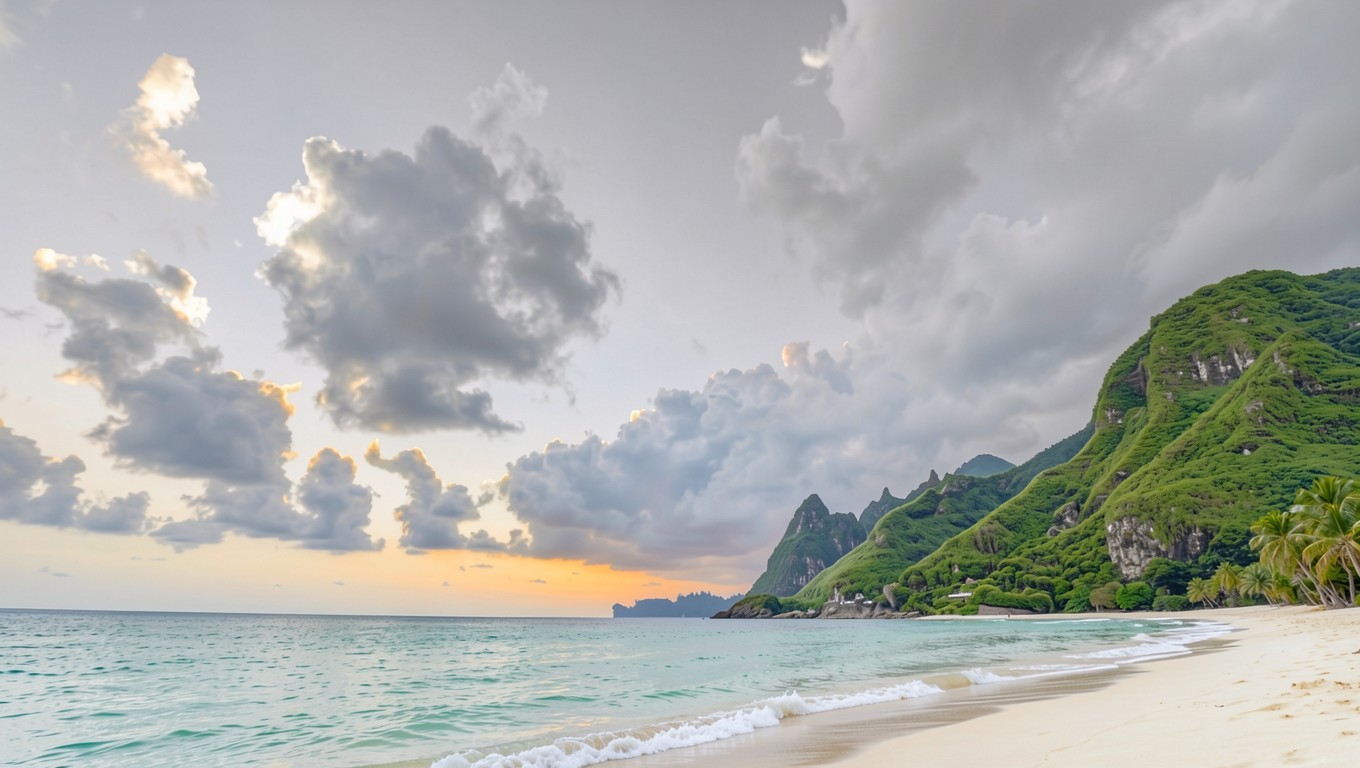 Тропический пляж с белым песком и горами