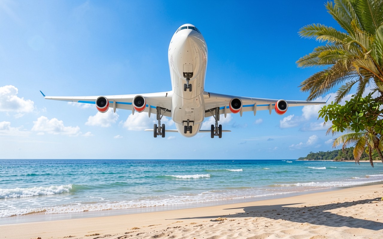 Белый пассажирский самолет над тропическим пляжем