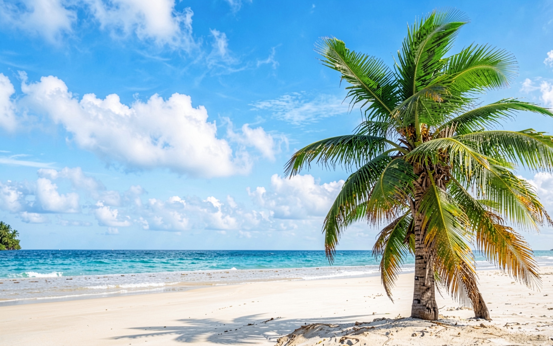 Пальма на белом песке тропического пляжа