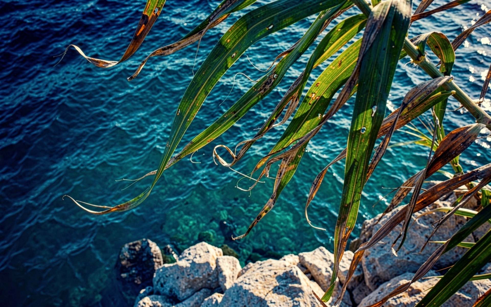 Зеленые листья тростника на фоне синего моря