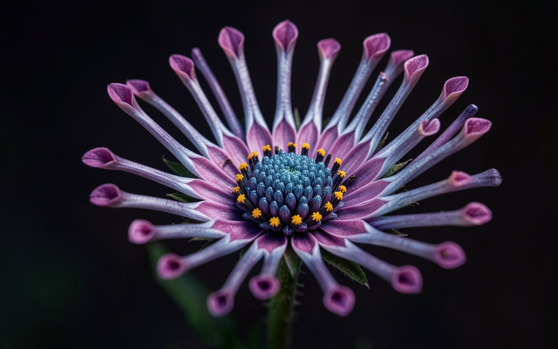 Фиолетовый цветок с трубчатыми лепестками на черном фоне