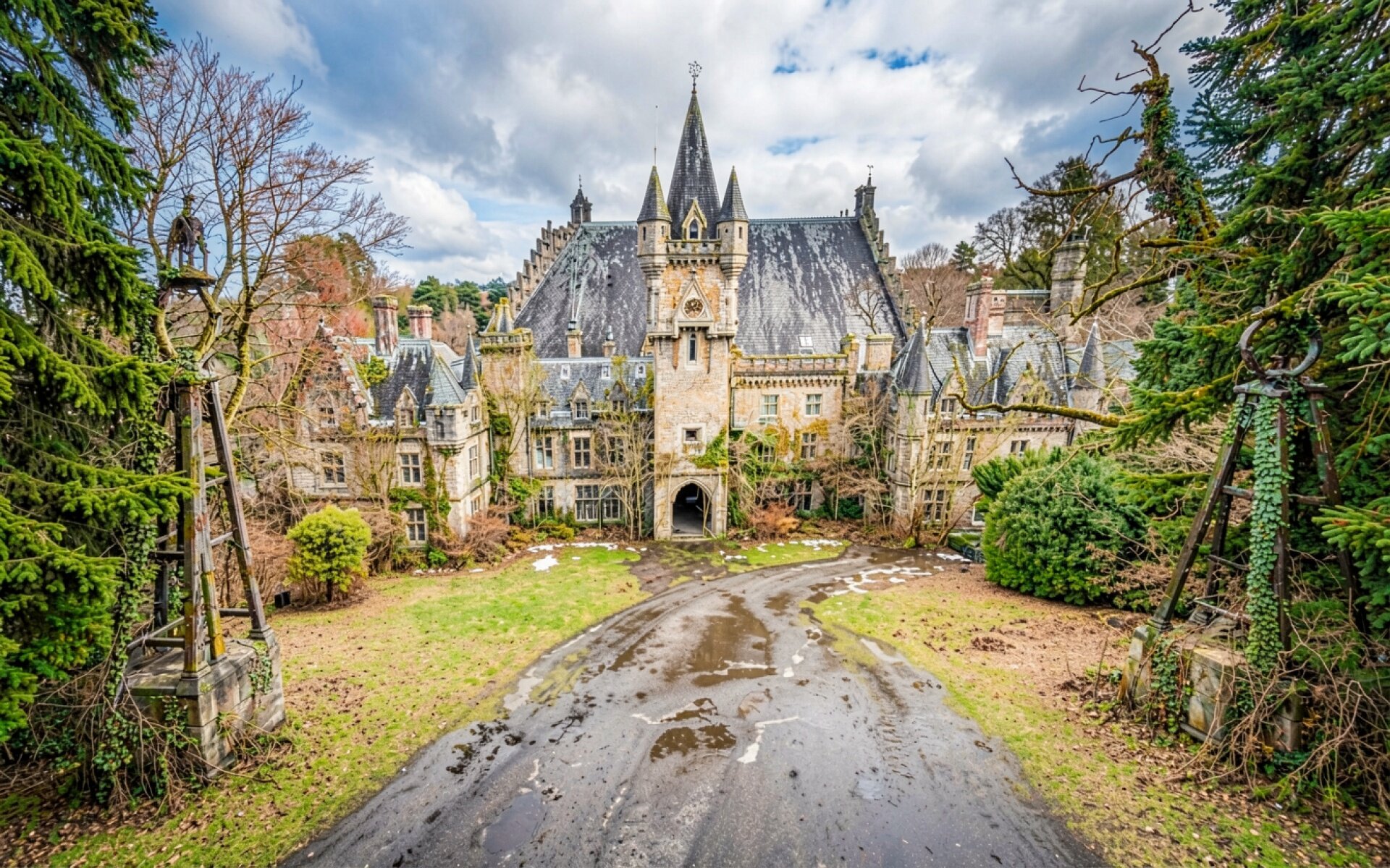 Готический замок в туманном осеннем лесу