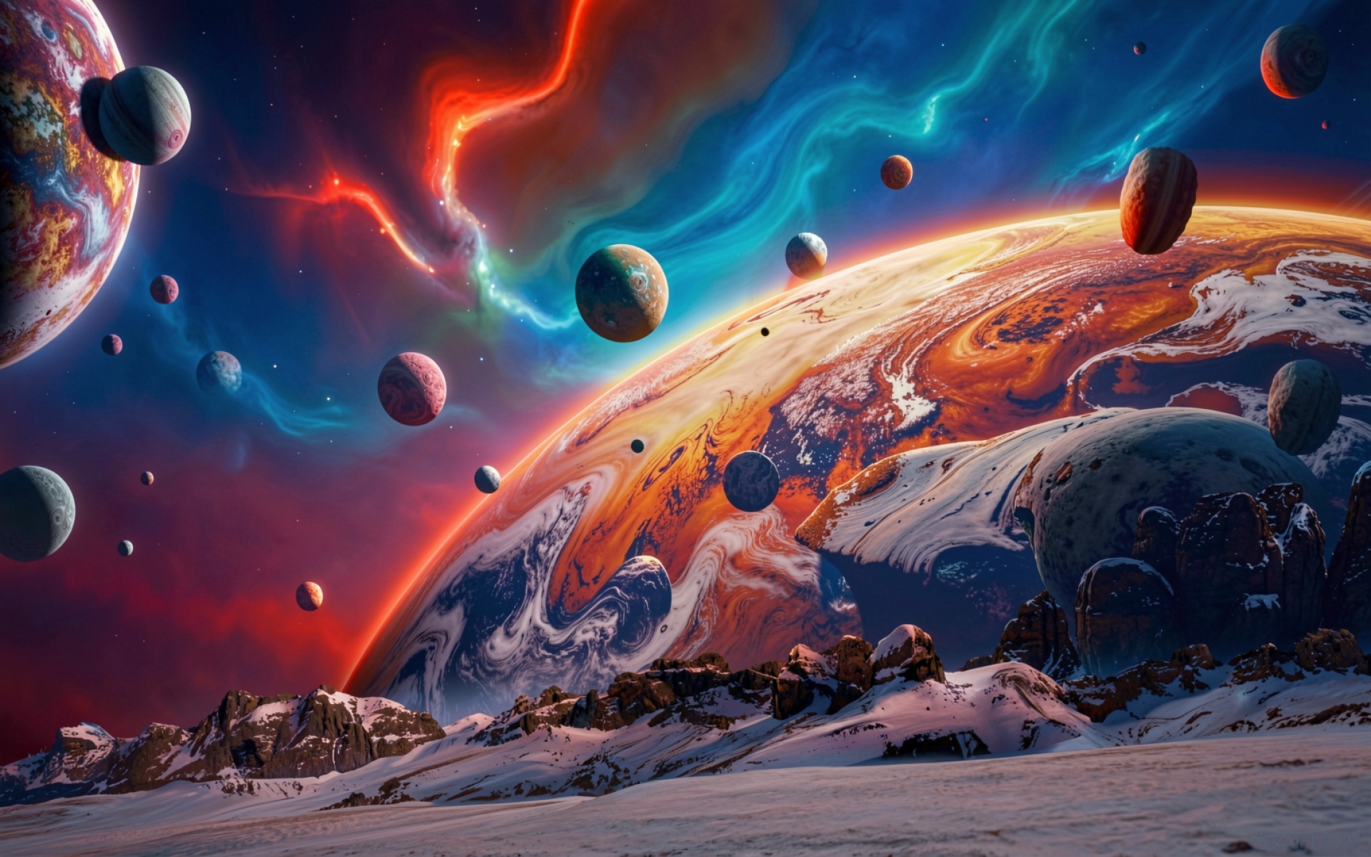 Сюрреалистичный космический пейзаж с планетами и туманностями
