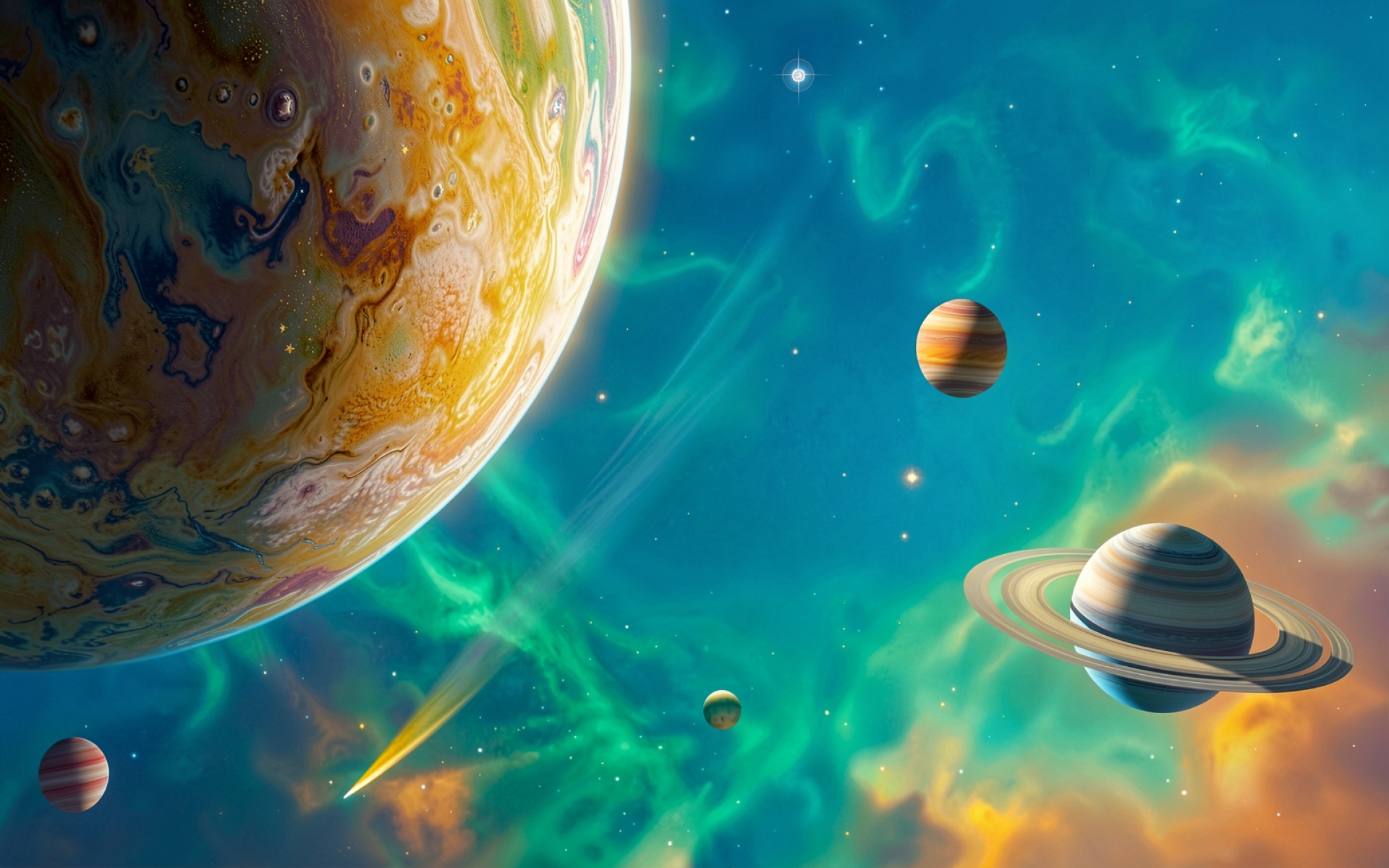 Планеты в космосе с зеленым туманным свечением