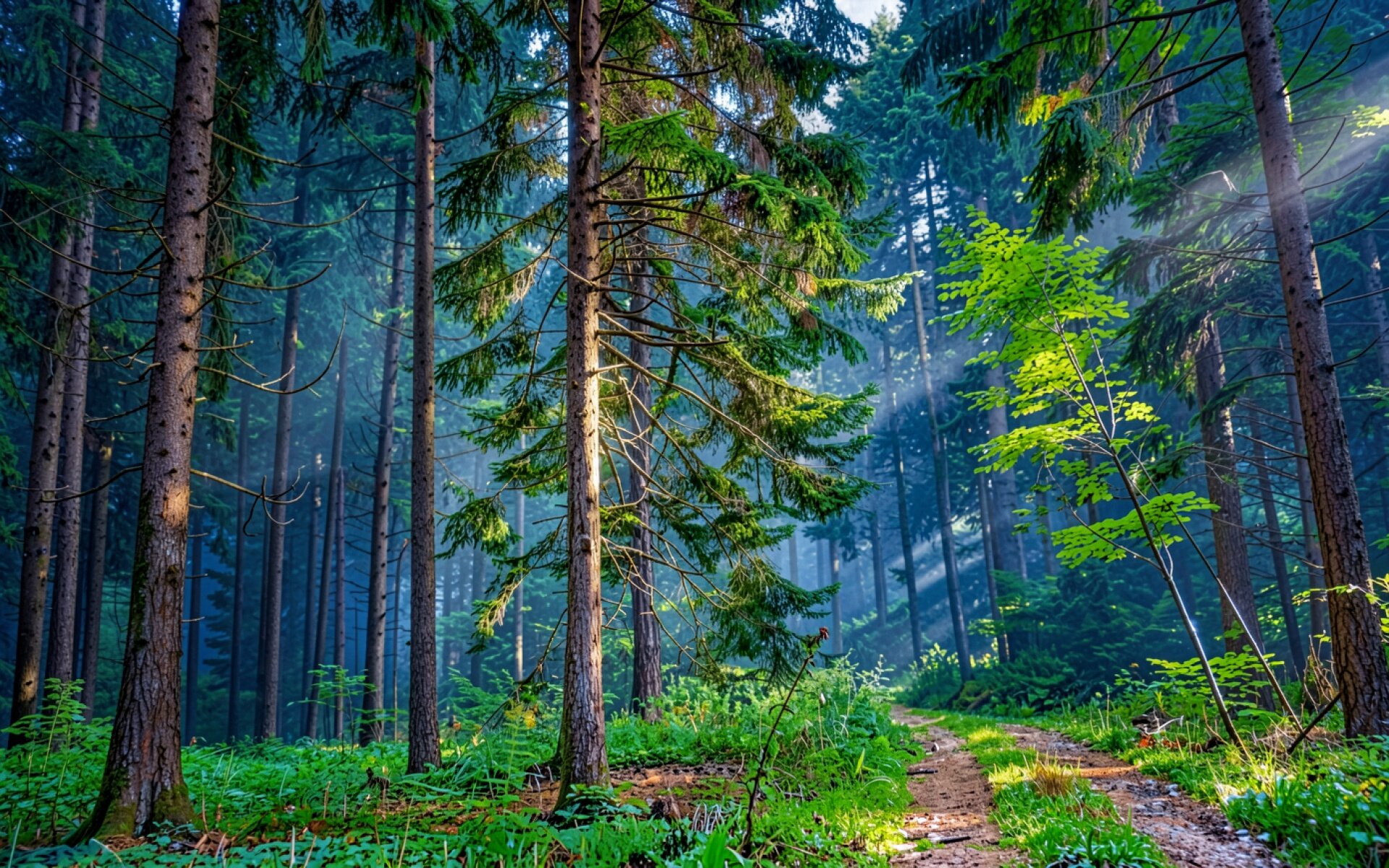 Хвойный лес с солнечными лучами и туманом
