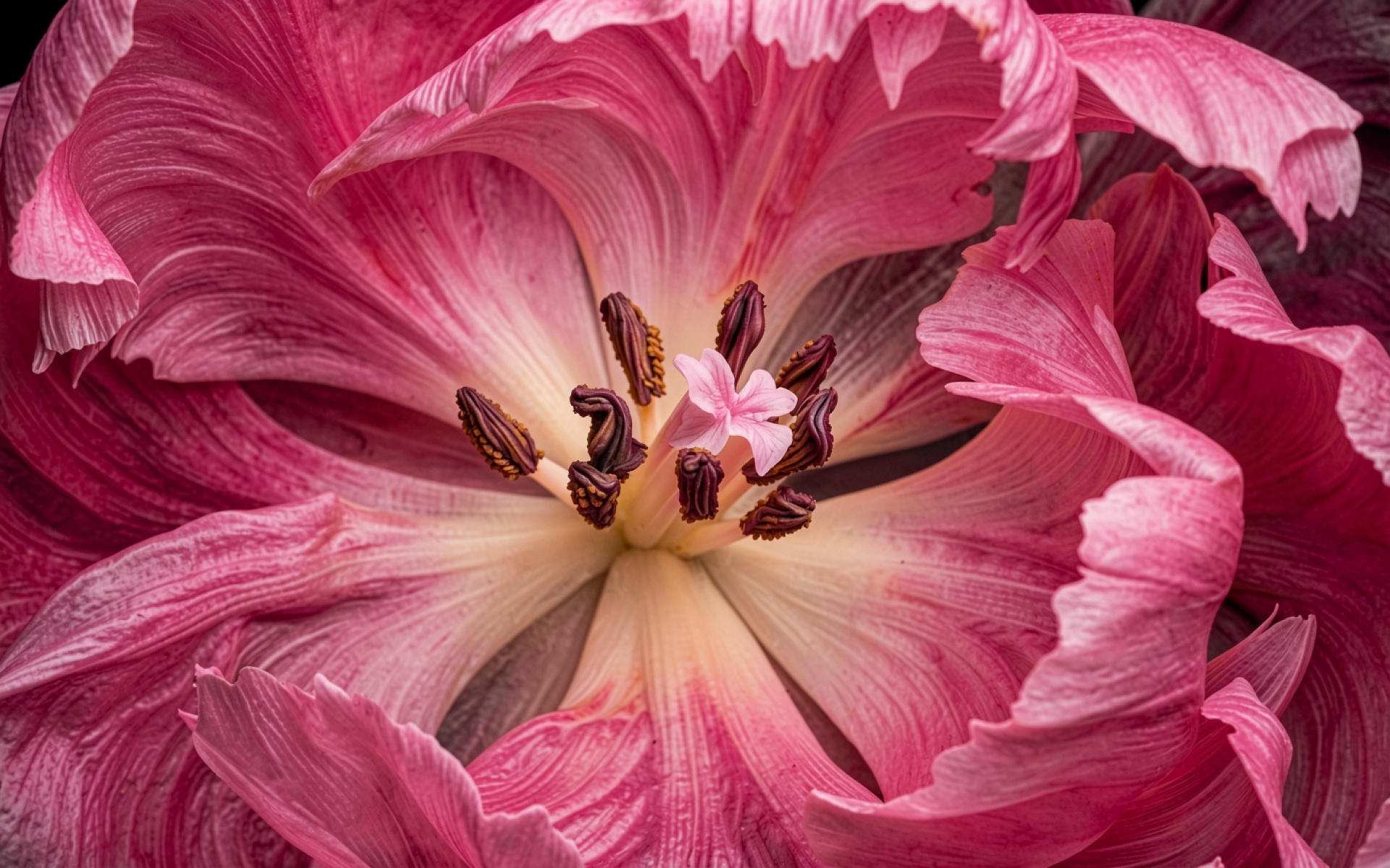 Розовый тюльпан с темными тычинками макро