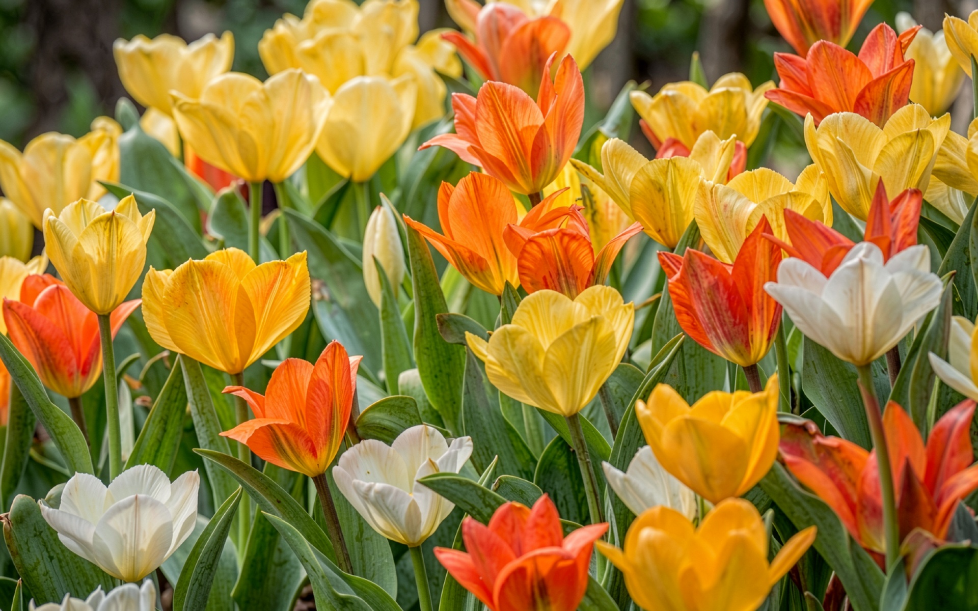 Поле желтых и оранжевых тюльпанов весной