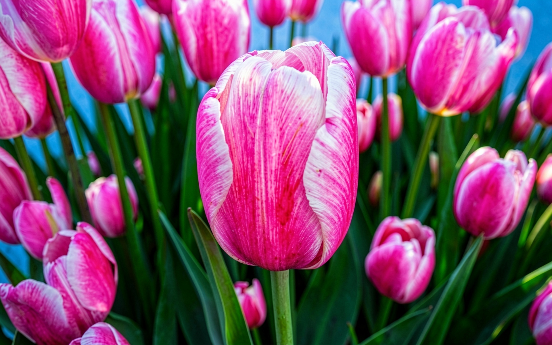 Розовые тюльпаны с белыми прожилками в саду