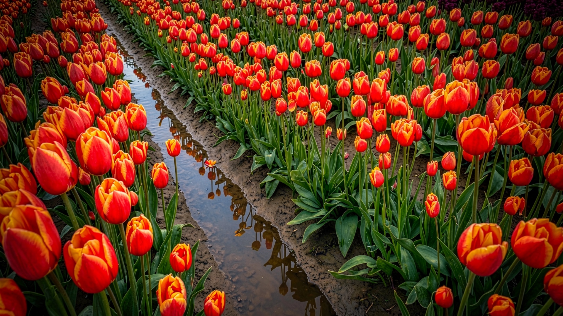 Поле красных тюльпанов с узким ручьем
