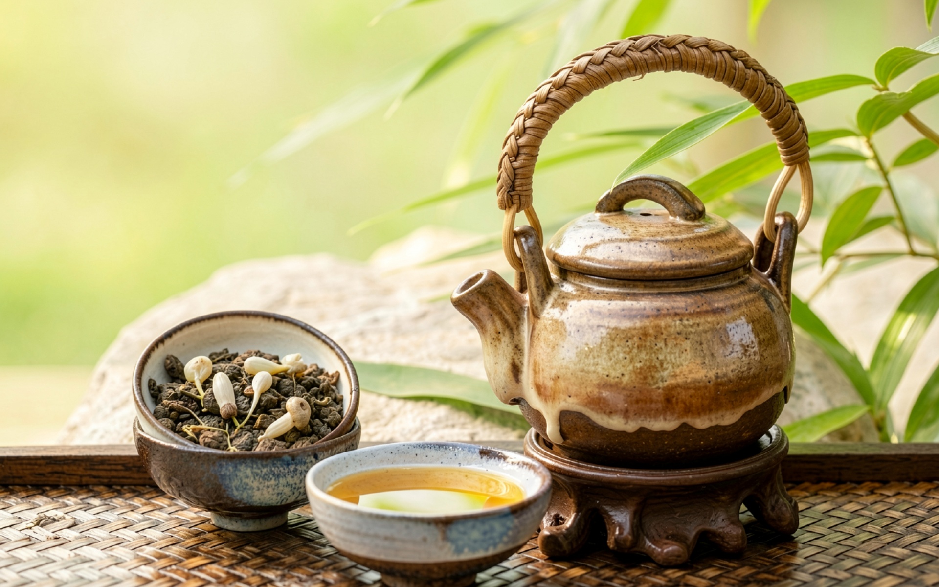 Керамический чайник с плетеным ушком в бамбуковом лесу