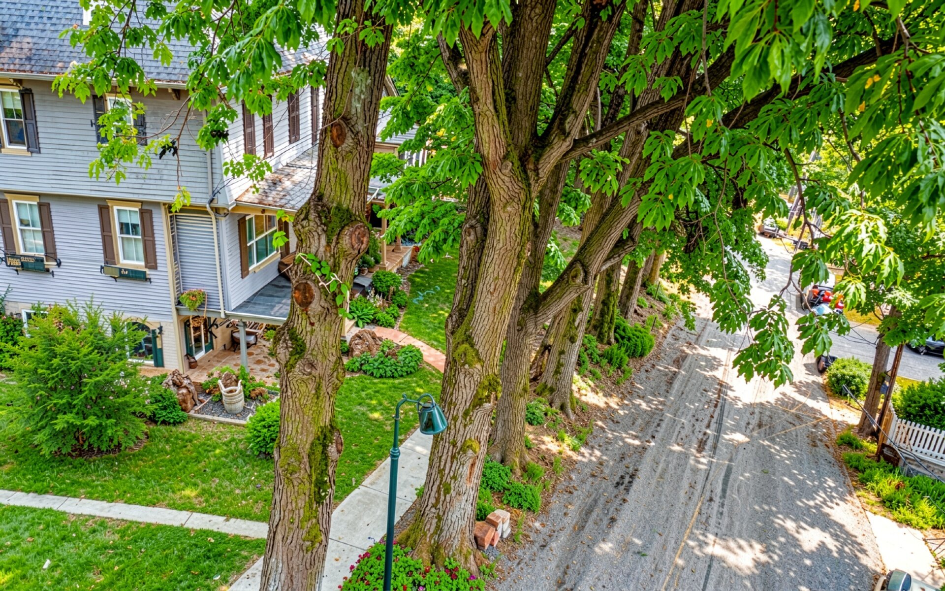 Уютный пригородный дом среди зеленых лиственных деревьев