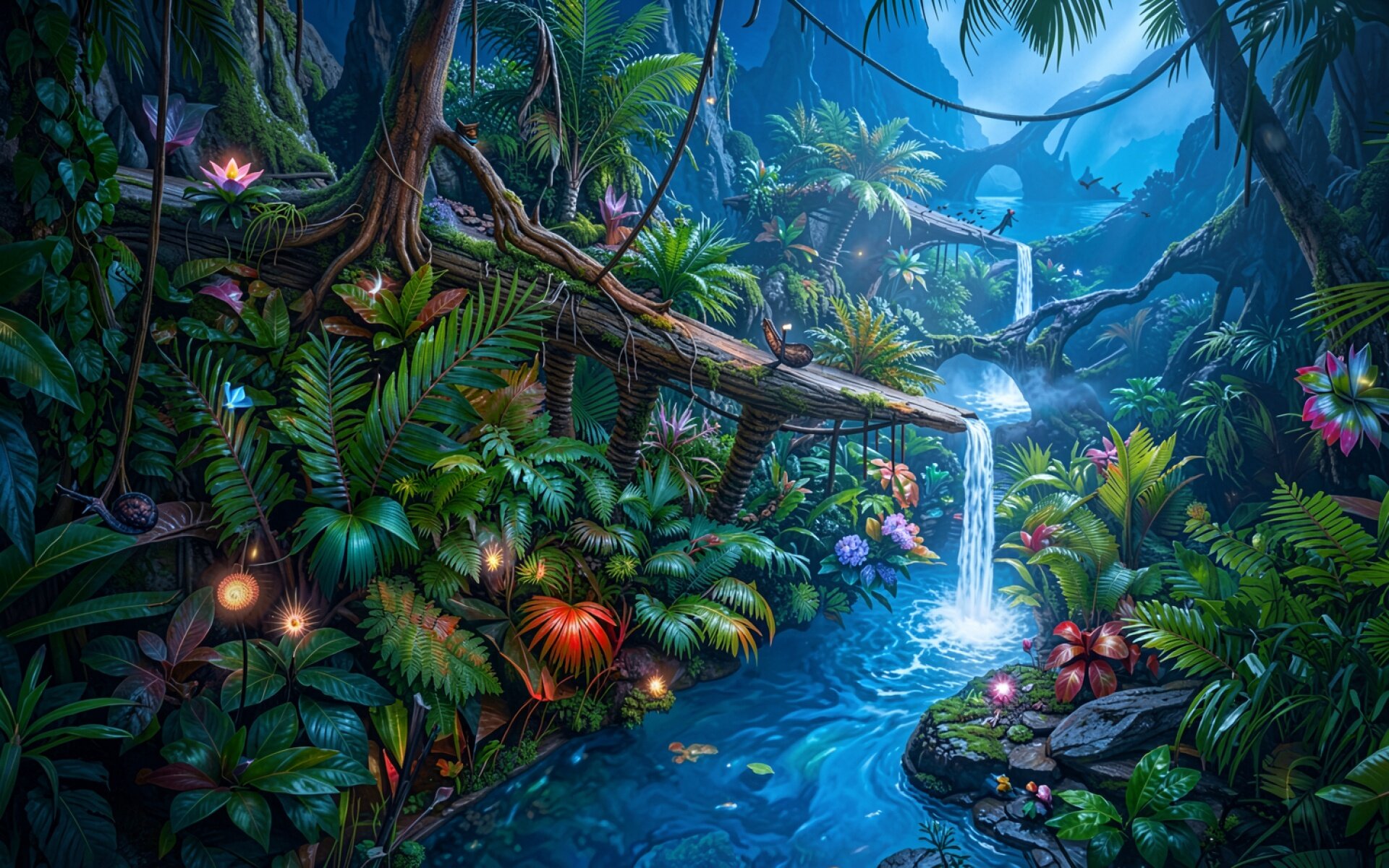 Фантастический тропический лес с неоновым водопадом