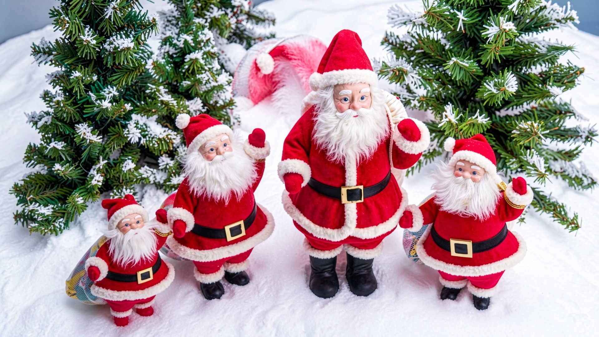 Фигурки Деда Мороза в зимнем снежном лесу