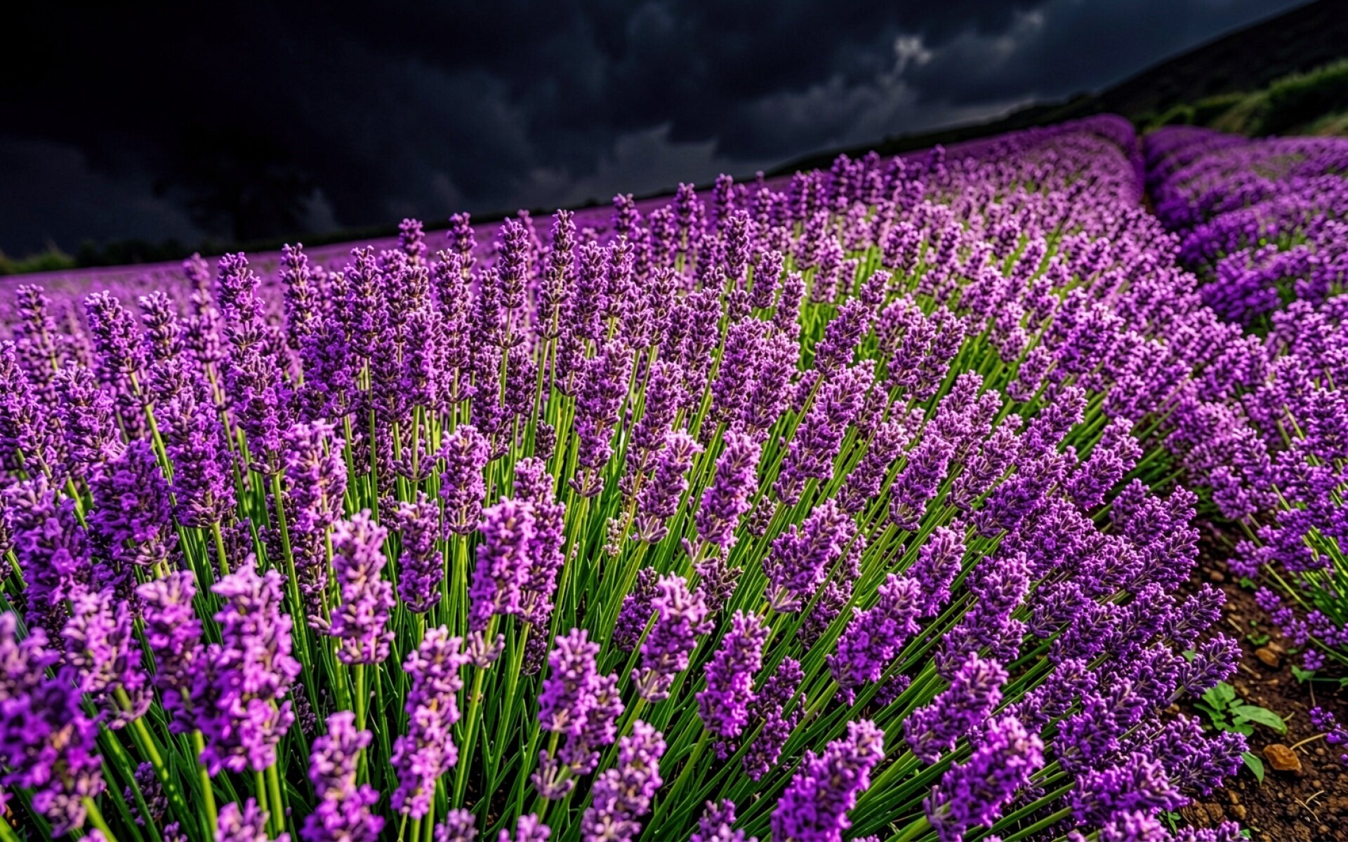 Поле фиолетовой лаванды под темным грозовым небом