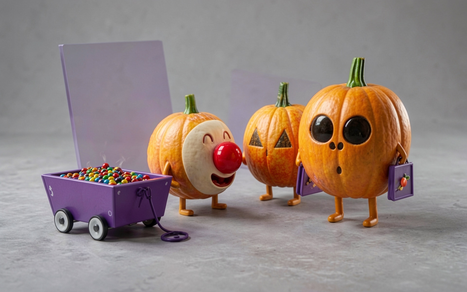 Три оранжевые тыквы с фиолетовой тележкой