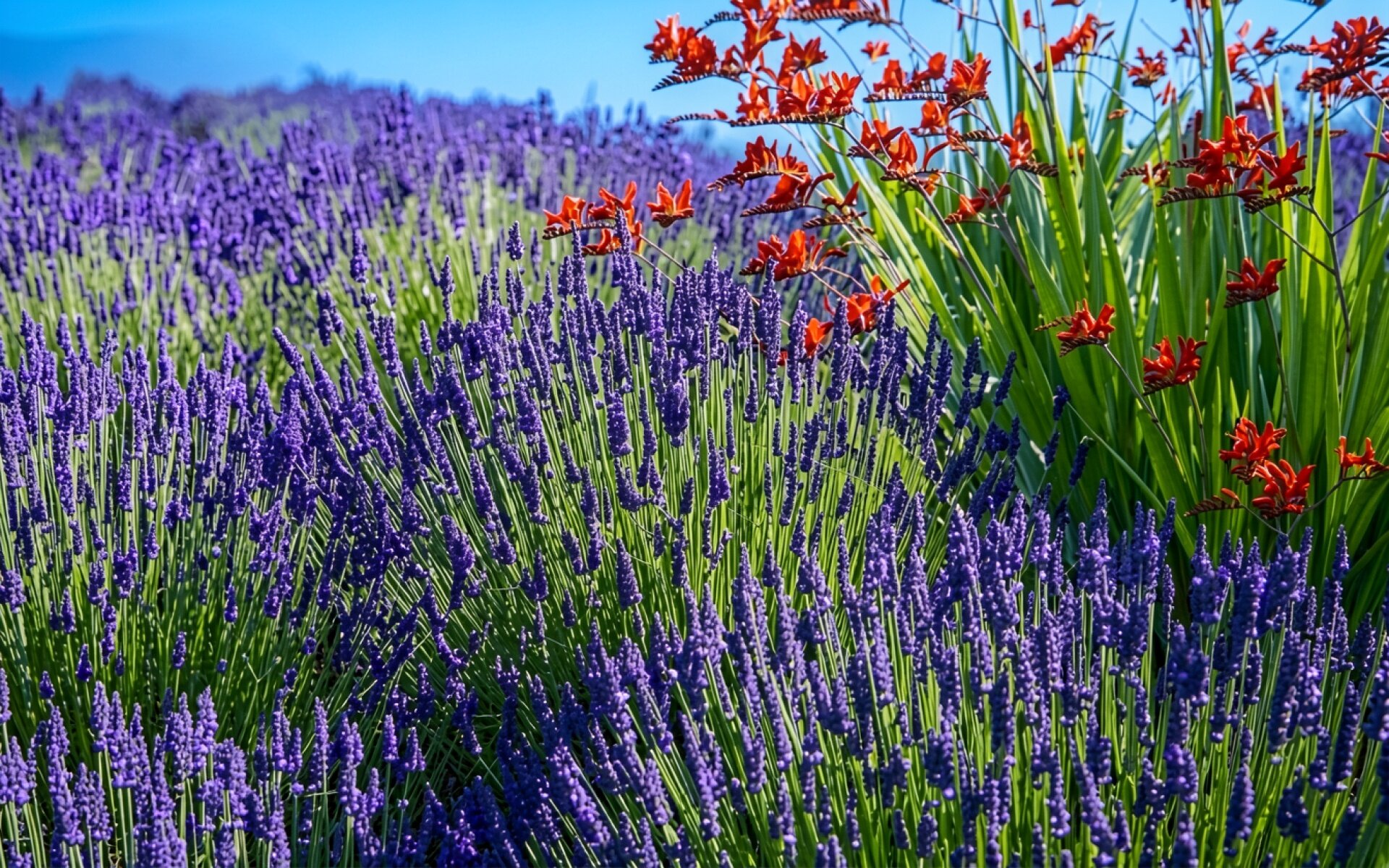 Поле фиолетовой лаванды с красными цветами