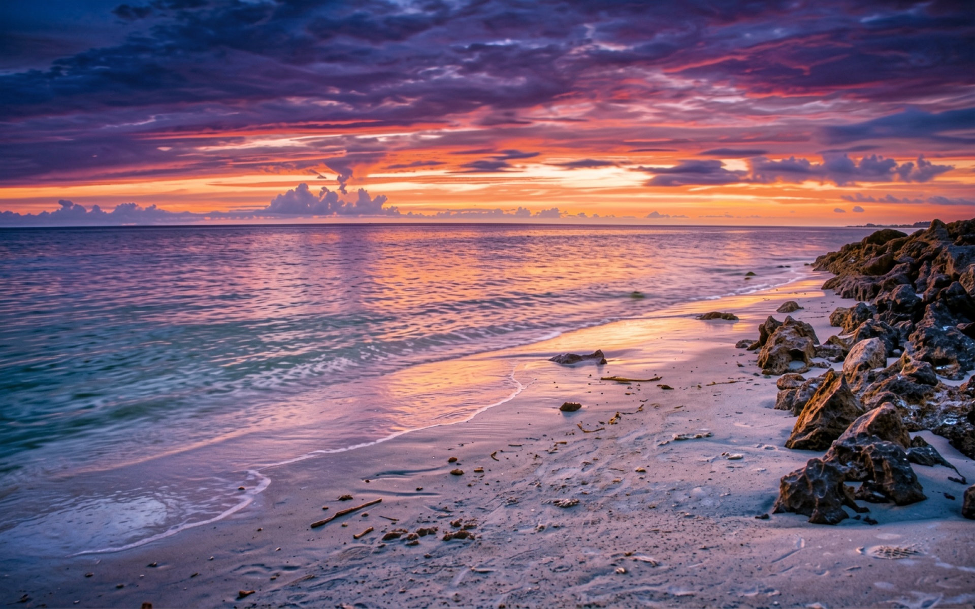 Тропический пляж с камнями в фиолетовом закате