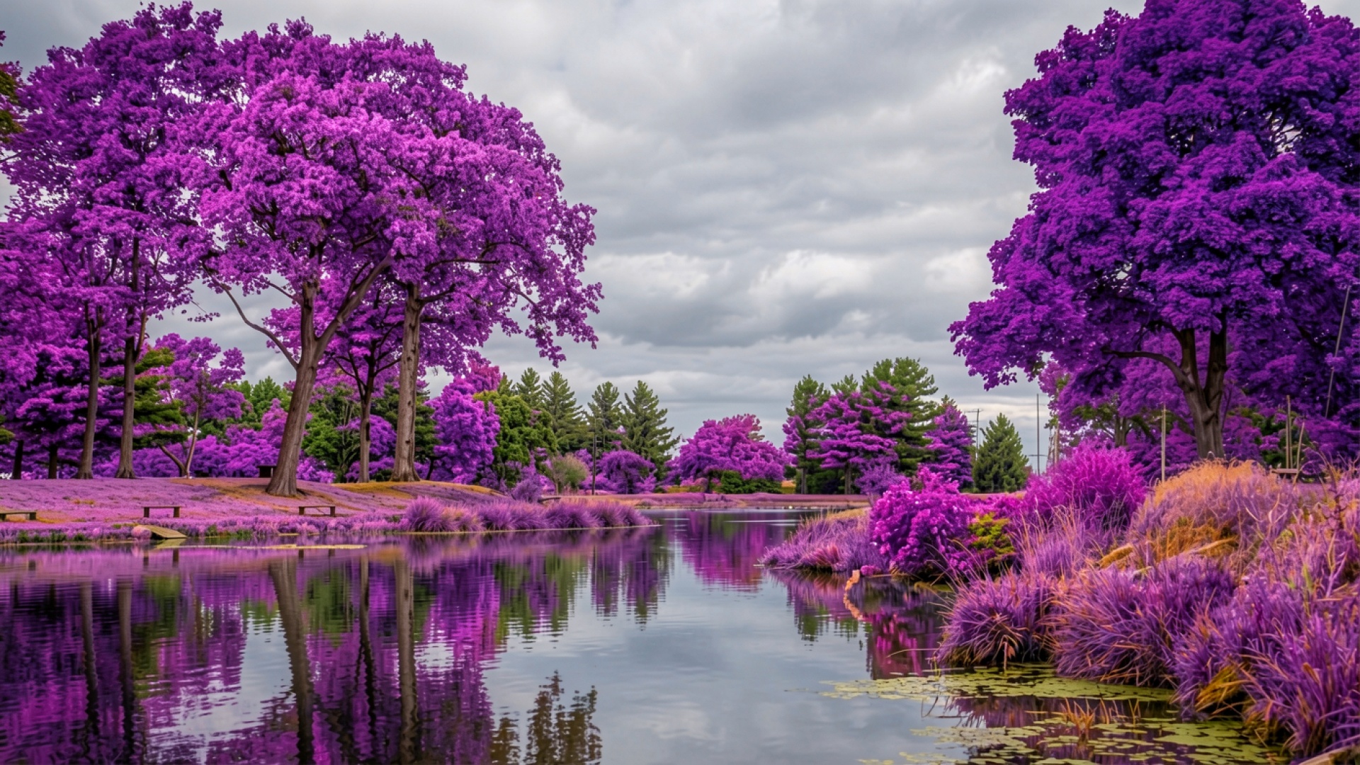 Фиолетовые деревья у озера в пасмурный день